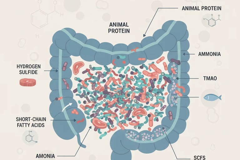 When some animal protein reaches the large intestine undigested, certain gut bacteria break it down in a process called putrefaction. This can produce hydrogen sulfide, ammonia, indoles, and polyamines. Small amounts are harmless, but too much can irritate the gut lining, upset your microbiome, and contribute to inflammation over time.