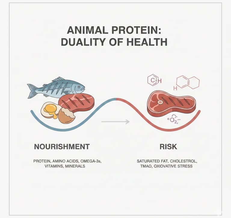 Animal protein is a powerful source of nourishment but must be consumed with understanding. It can strengthen the body or irritate it depending on cooking methods, portion size, and the rest of the diet. The real poison is not the protein itself but imbalance. Adequate fiber, antioxidants, and plant-based foods keep toxic by-products low. Knowledge allows food to become medicine. Ignorance turns the same food into potential harm. Understanding the science of animal protein, gut microbiome, cooking methods, and long-term health allows us to enjoy animal protein as a source of strength rather than poison.